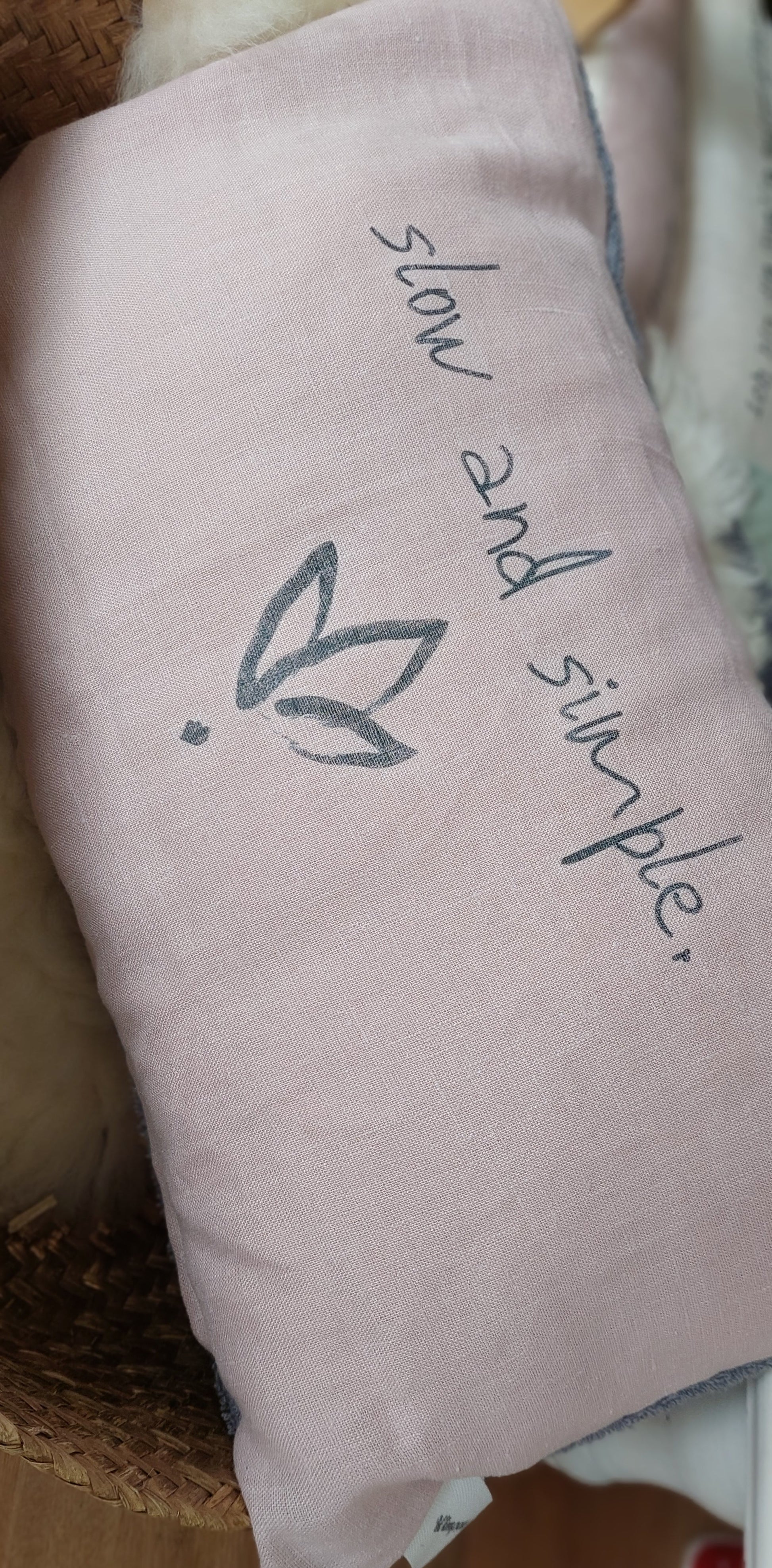 Zirbenkissen aus Bio Leinen, handbedruckt mit einer liebevollen Affirmation. Für dich.